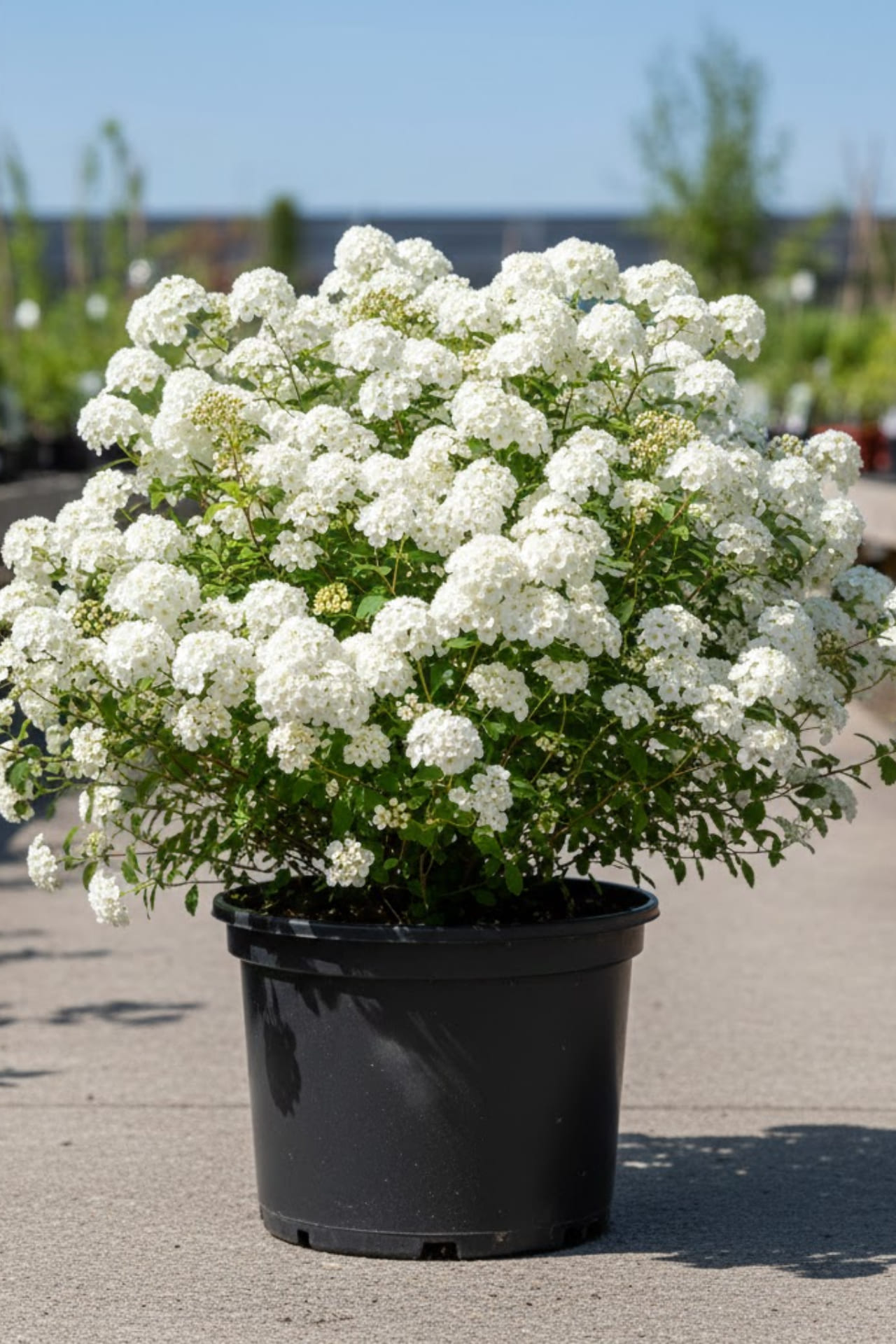 - Белые, многочисленные, в щитковидных соцветиях, густо покрывающих побеги, зацветает позже исходного вида, в июне, цветет 15-25 дней; очень декоративные; цветочные почки закладываются на побегах прошлого года