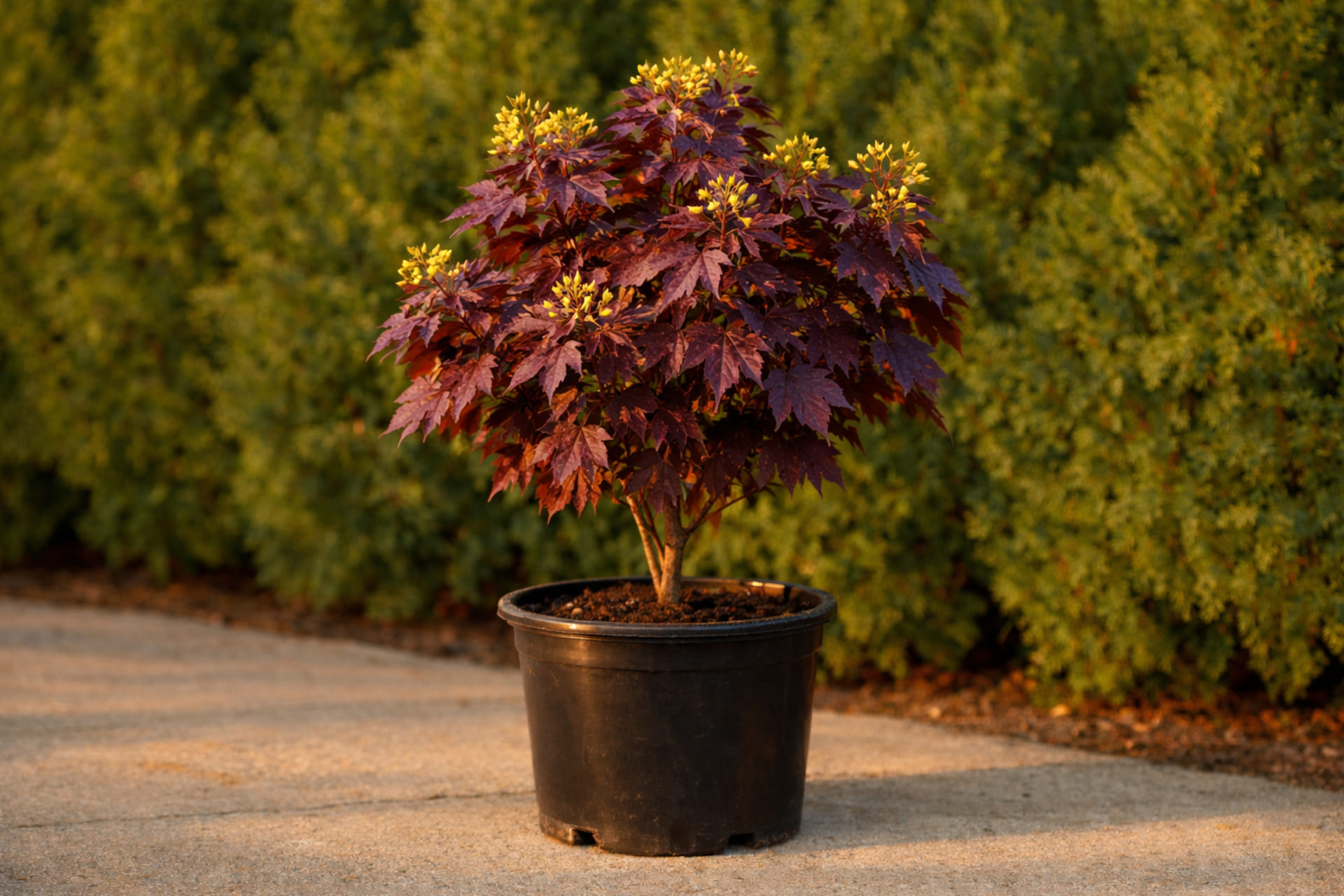- Листья пятилопастные, некрупные, при распускании – ярко-малиновые, летом – пурпурные, в тени зеленеют.