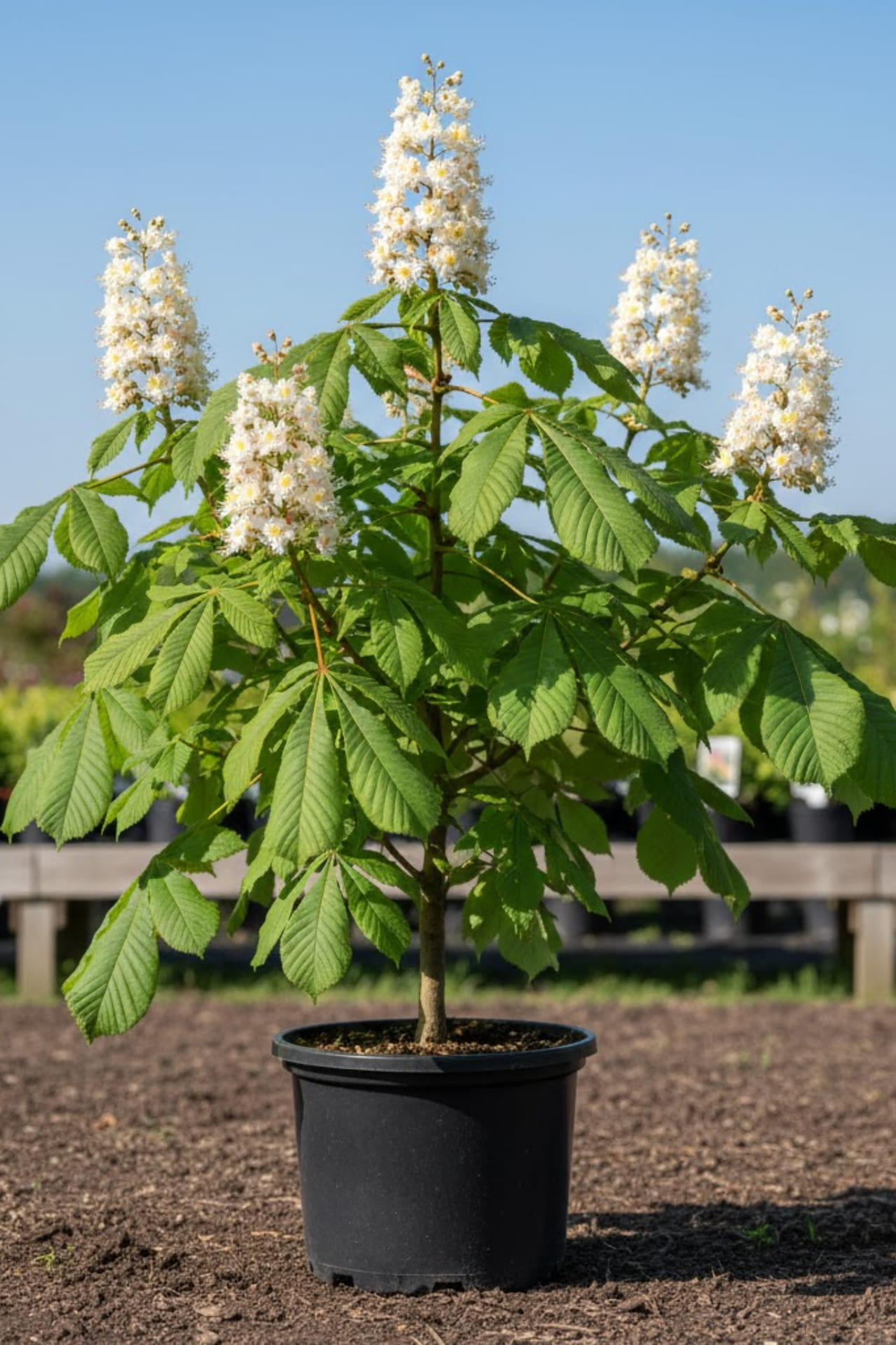 - Цветет с начала до середины мая, соцветия до 30 см высотой, пирамидальные метелки из крупных белых цветков с красным узором; плодов почти не бывает