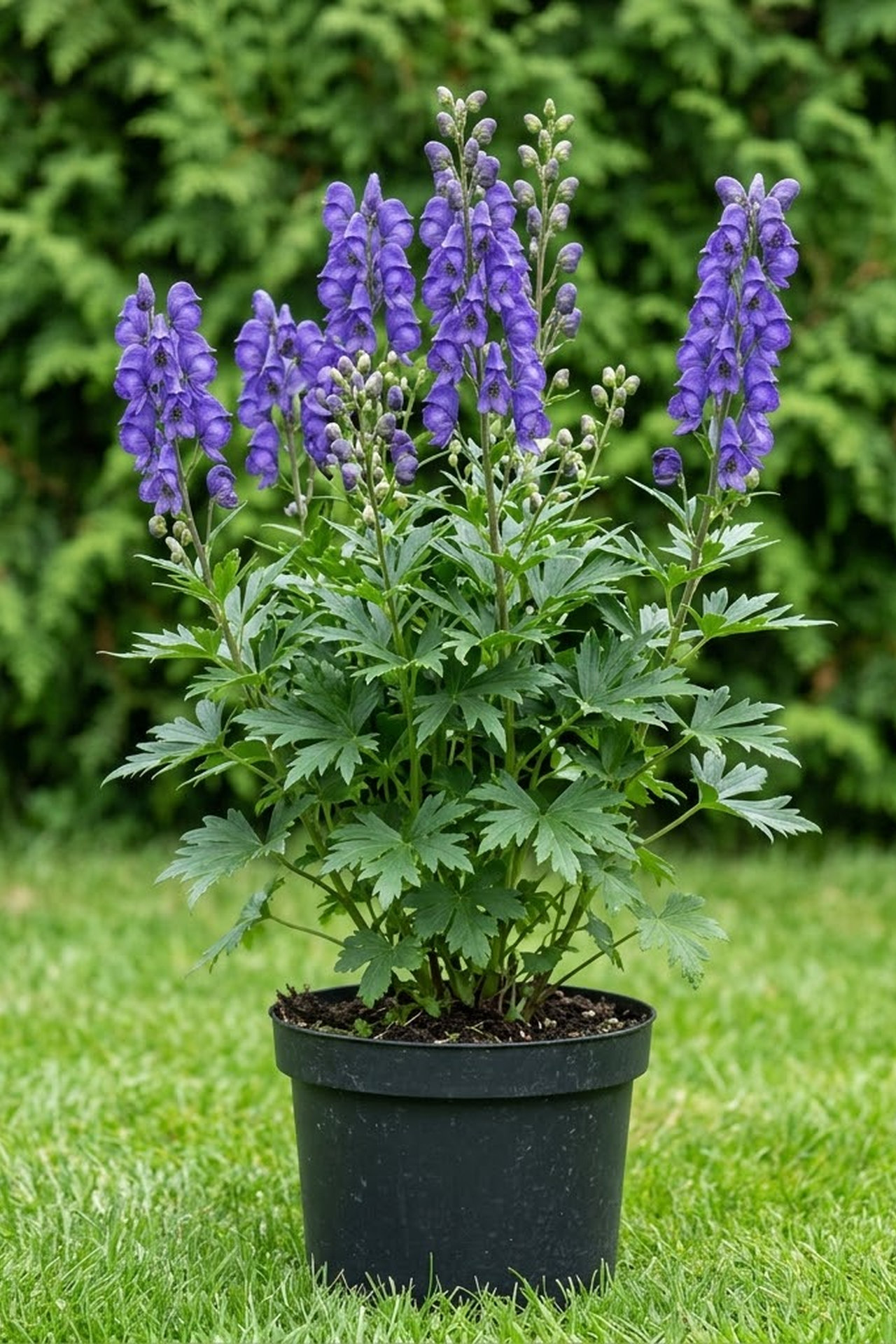 - высокорослый куст с мощным клубневидным корневищем. Тёмно-зелёные блестящие листья пальчато-рассечённые. Высокие рыхлые соцветия образованы крупными цветками в форме шлема