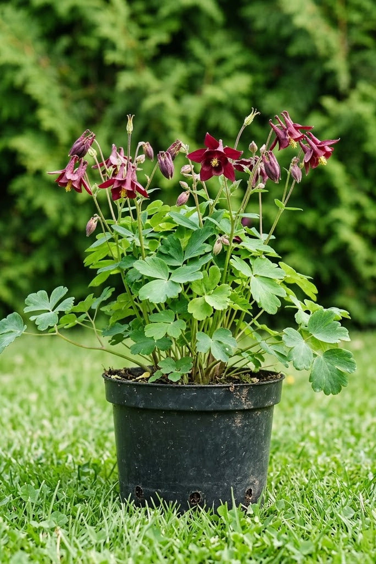 - Цветки средние с короткими шпорцами, необычной формы, махровые, с множеством узких бордовых лепестков
