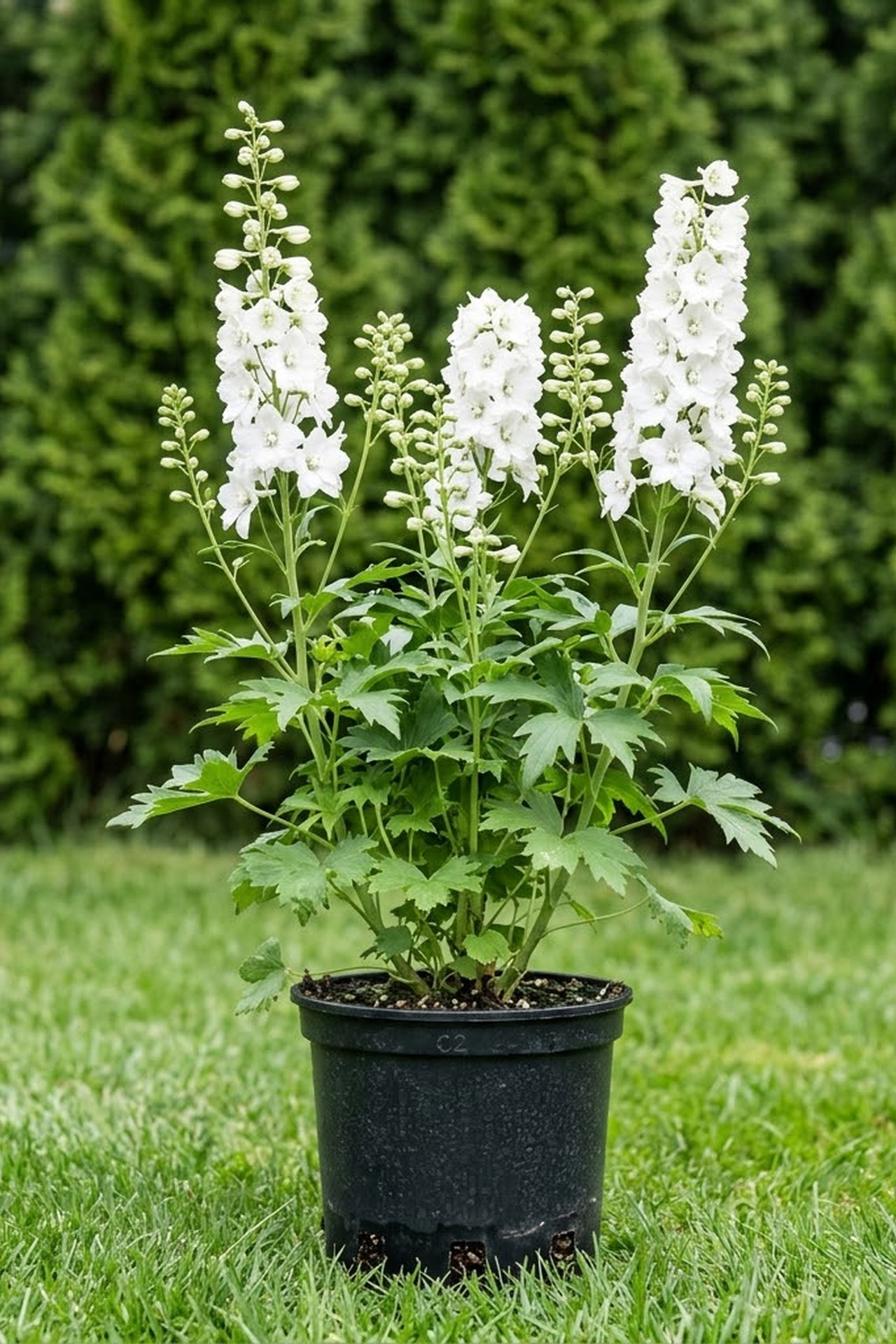 - цветки крупные, 6-7 см в диаметре, чисто-белой окраски, с белым глазком и бело-серыми пыльниками, полумахровые, неправильные с длинным шпорцем, собраны в конусовидные соцветия средней плотности, длиной 60-70 см
