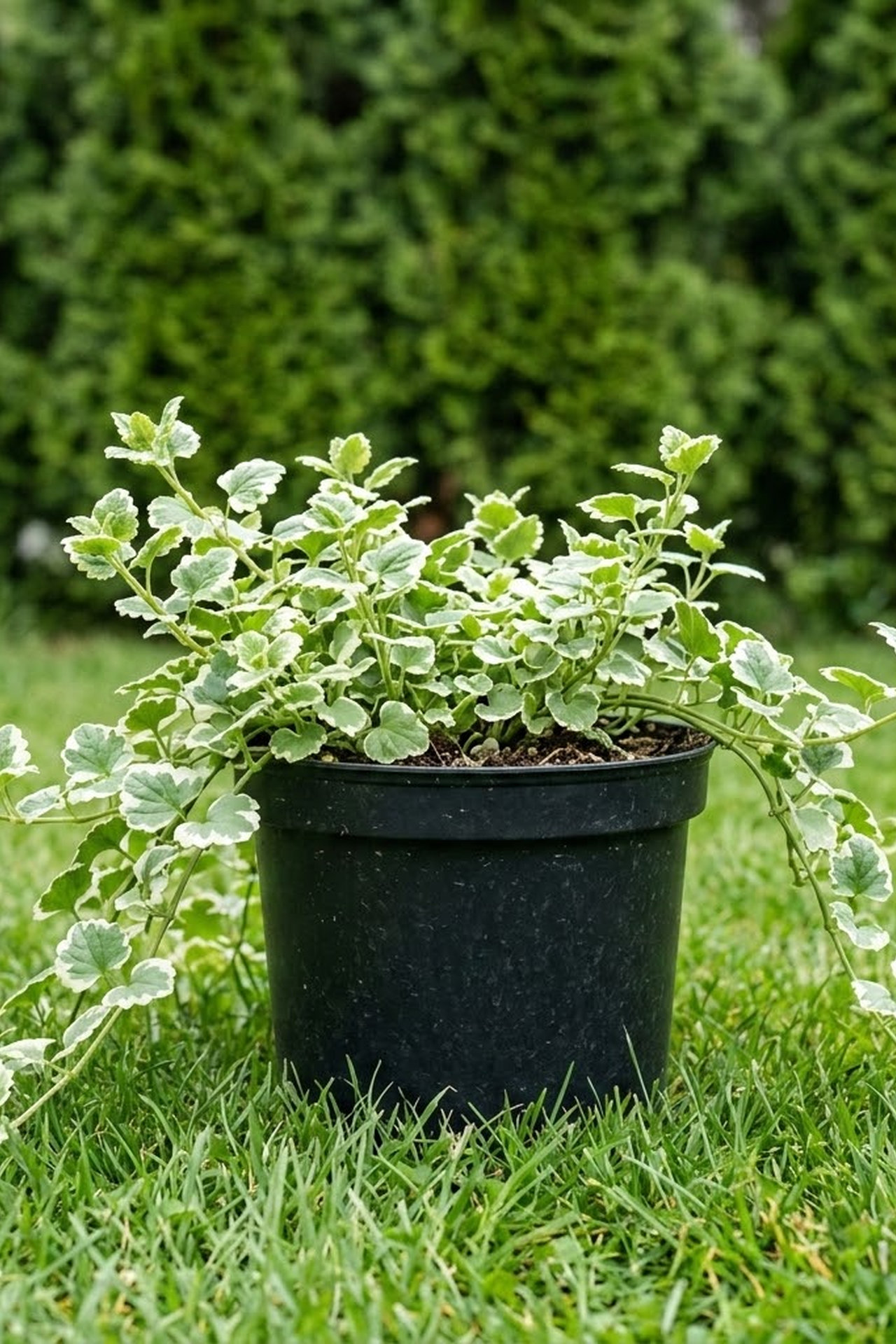 - Листья округлые зеленые с белым краем