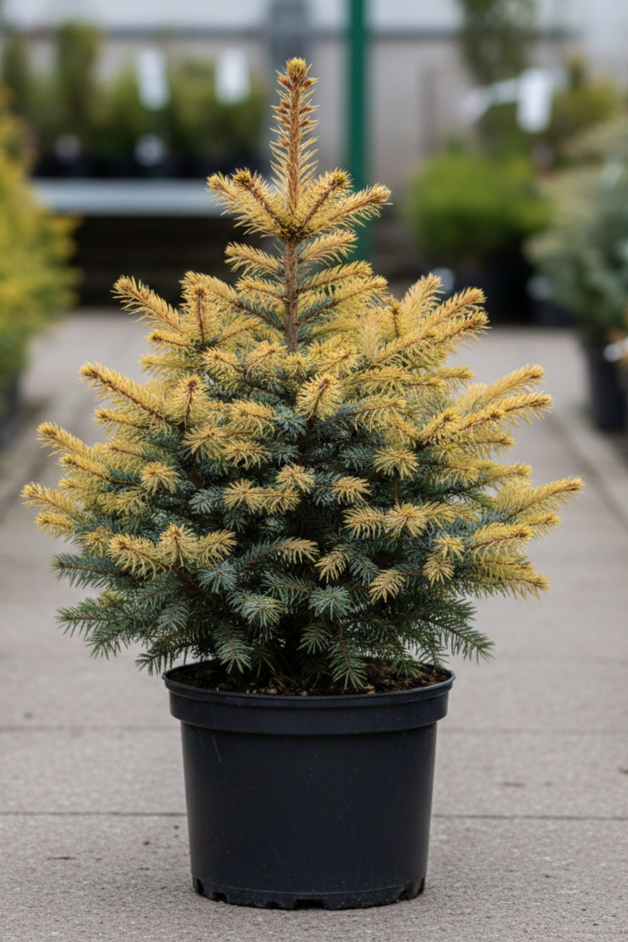 - Ветви горизонтально направлены. Побеги твёрдые, покрыты зелёными иглами. На молодых побегах кремово-желтая.