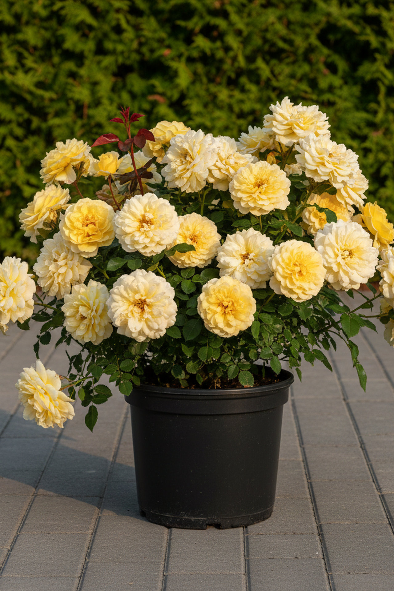 - Аромат сильный (6 из 10 баллов), необычный (смесь солодки, леденцов и пряностей). Цветки собраны в большие соцветия.Чашевидные цветки в старинном стиле, диаметром 7-8 см,махровые (35 лепестков), окраска меняется от нежно-желтой по краям до янтарно-золотистой в центре. Насыщенный необычный аромат, сочетает в себе сладкие и ликерные нотки.